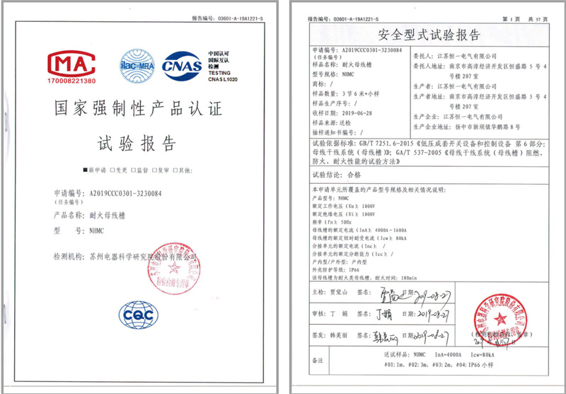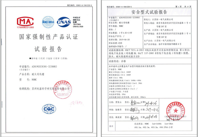 NHMC耐火母线槽4000A-1600A产品认证自我声明