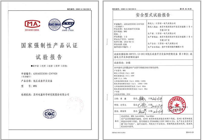MNS低压成套开关设备4000A-1600A试验报告
